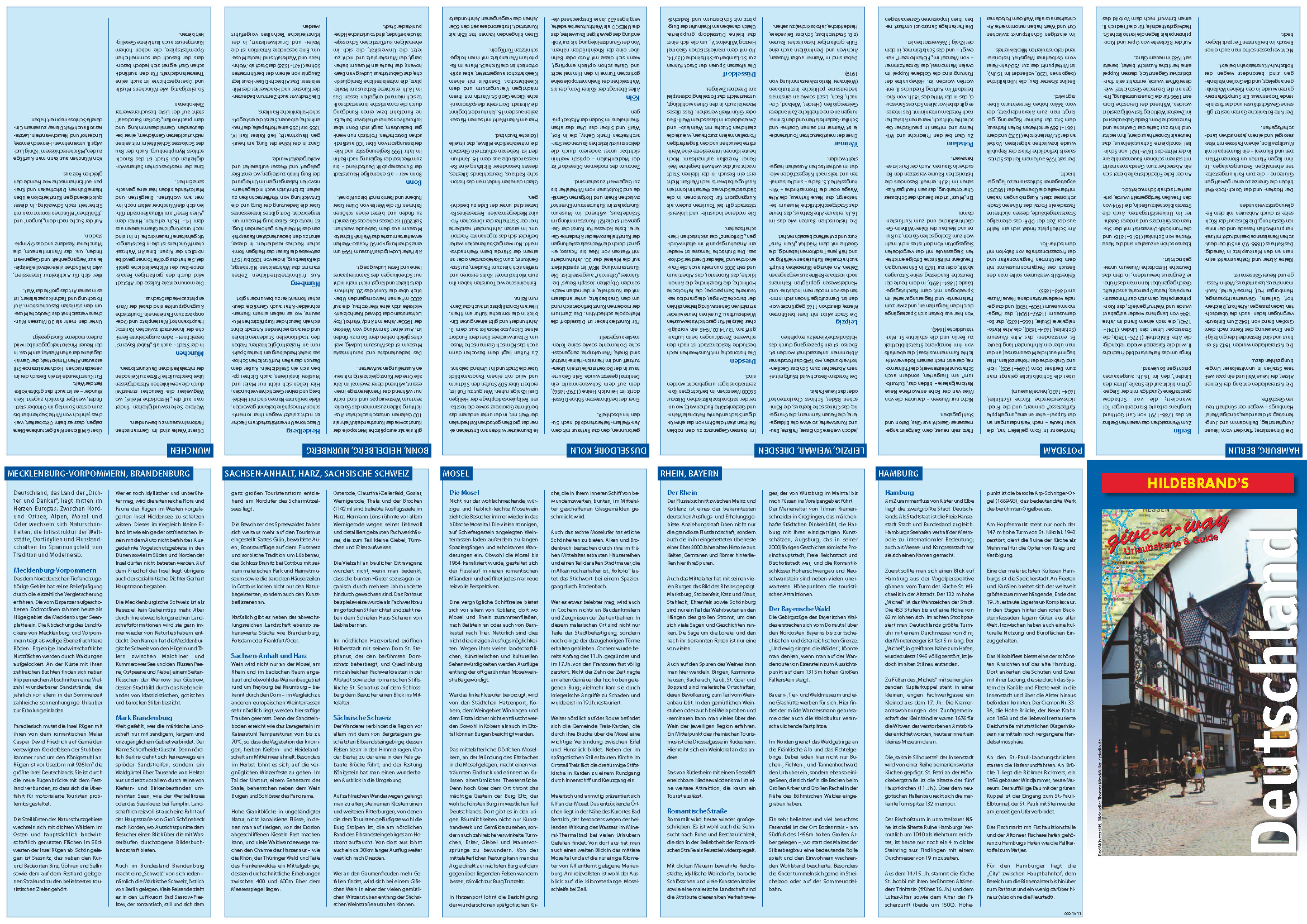 Berlin, Bonn, Dresden, Hamburg, Heidelberg, Leipzig, München, Weimar, Der Bayrische Wald, Mark Brandenburg, Mecklenburg-Vorpommern, Die Mosel, Der Rhein, Romantische Straße, Sachsen-Anhalt, Harz, Sächsische Schweiz